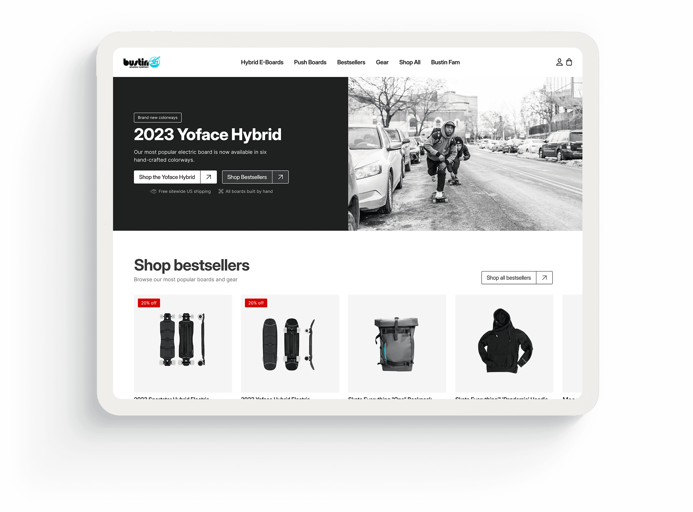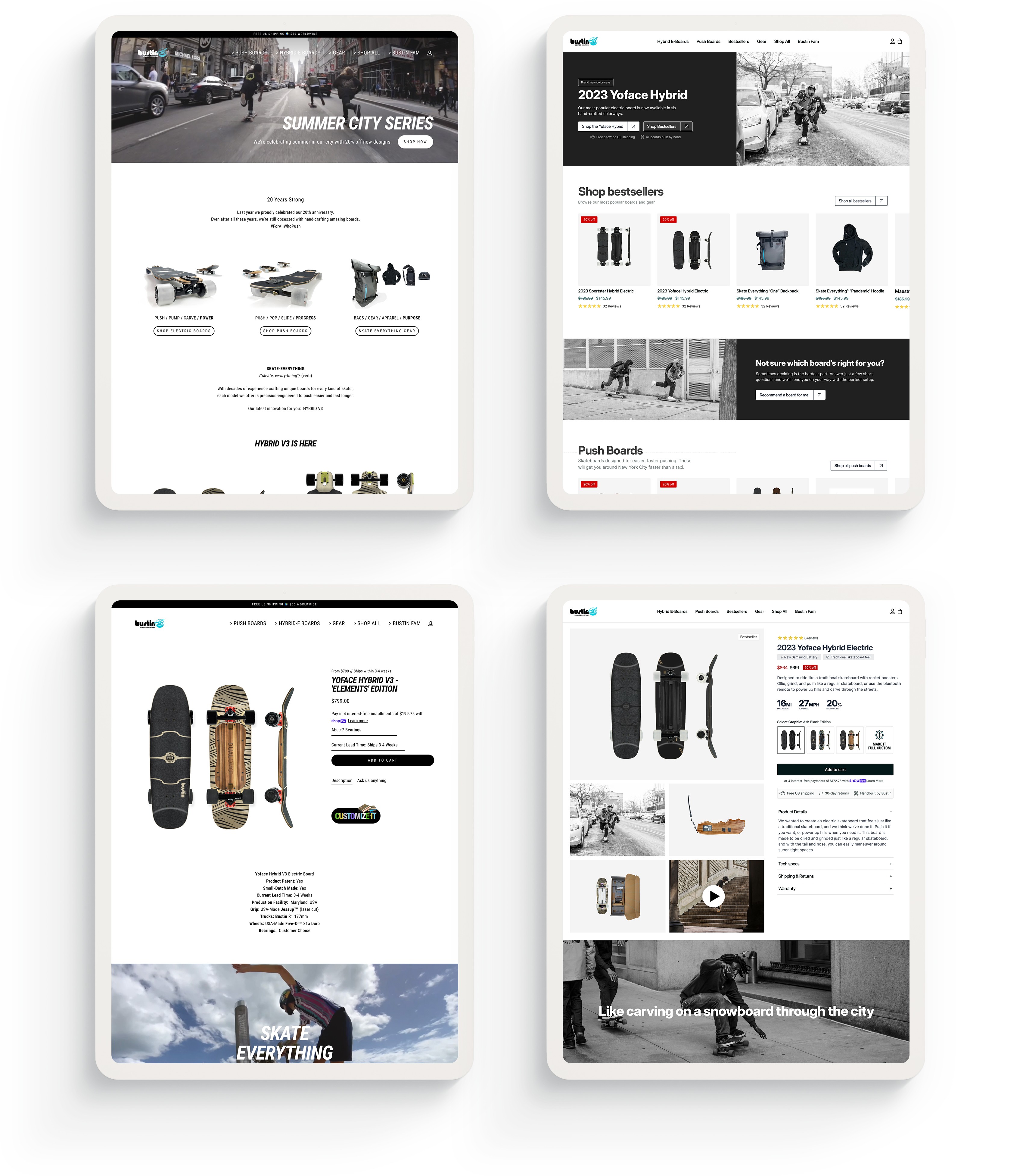 For example, rather than using a prototypical hamburger menu, Bustin's mobile menu was a full-width CTA pinned to the bottom of the screen. Additionally, PDPs used dropdown menus rather than segmented buttons for variant selectors with just 3-4 options.