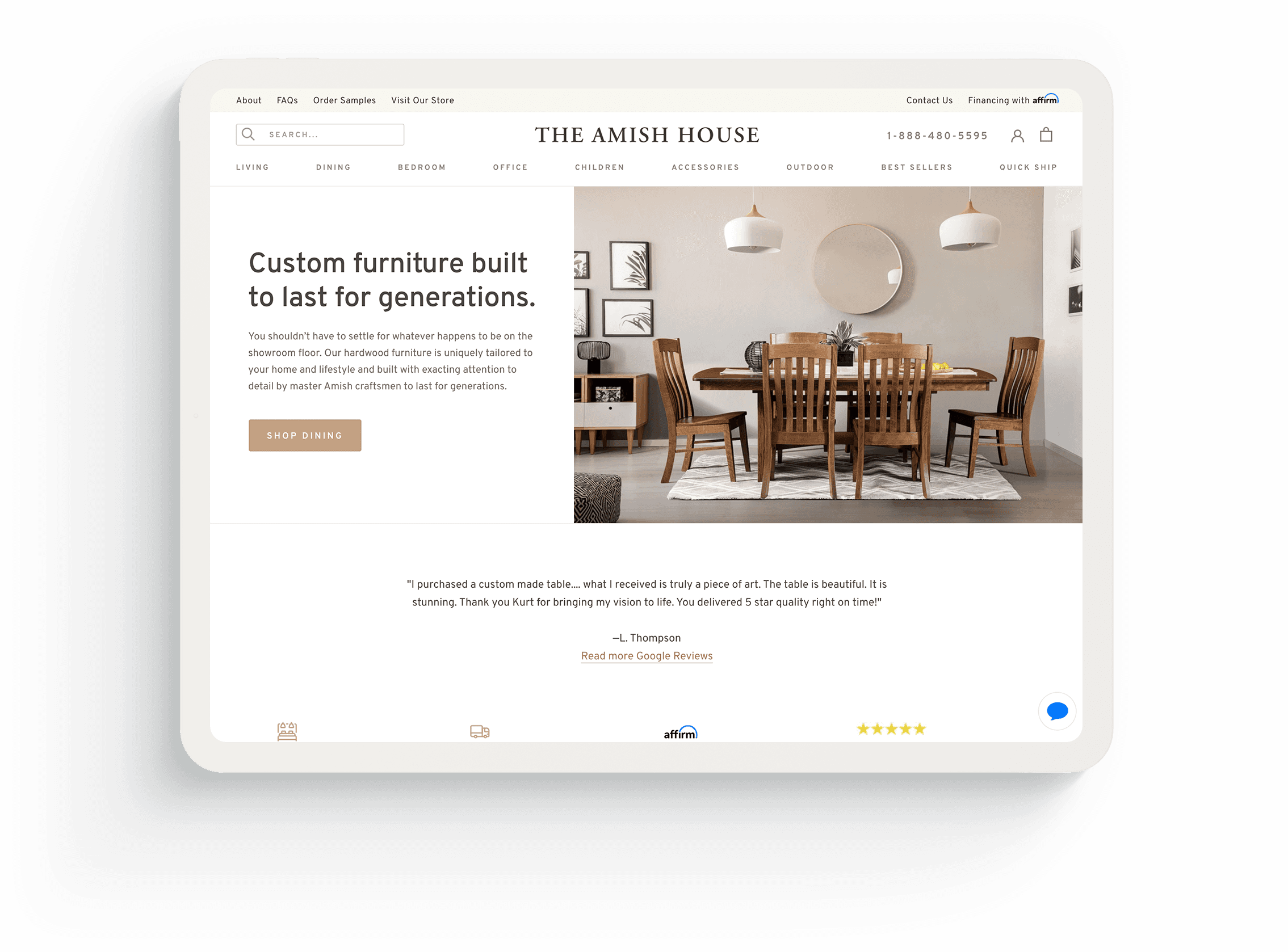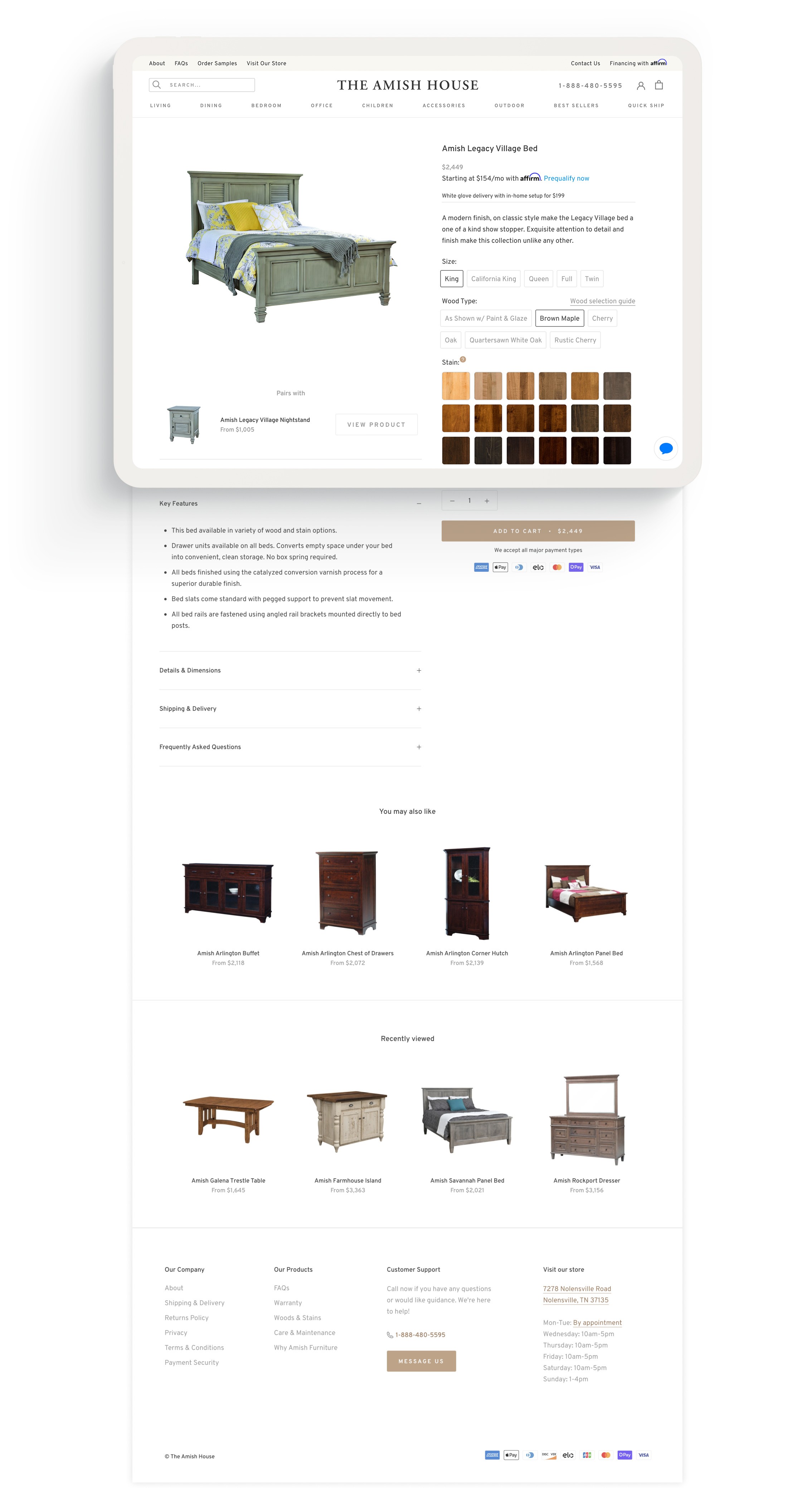 The Amish House is a bootstrapped retailer of Amish furniture with over 1,000 configurable products and 2M+ product variants. As partner and head of digital, I owned the design, development, and optimization of our Shopify store, as well as all digital brick-and-mortar initiatives. Over four years, I helped scale the company from launch to $1.5M+ in annual revenue with effectively zero marketing budget.